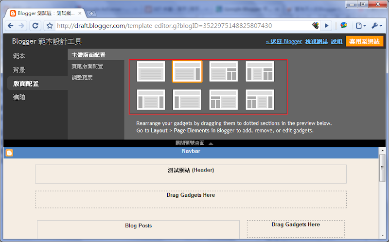 此外,在【版面配置】處可以選擇你是要兩欄式、三欄式或是褲管式的模版,而選擇之後會在下方即時顯示。