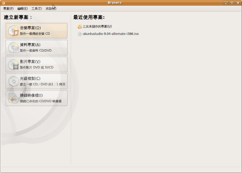 Brasero 是 Ubuntu 的預設燒錄軟體,是 Gnome 少數幾個好用的燒錄軟體。而此軟體雖然說功能並不算突出,但是他有中文語系,而且操作界面還蠻簡單易懂的,當然裡面還有一些功能可能大家沒注意到,而海芋也整理出了教學,供大家做參考。不過比較可惜的是,而燒錄影像光碟的部份,目前怎麼試都試不成功,等待試成功後再增加上去囉。