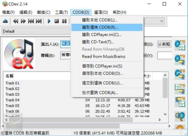 把音樂 CD 放進光碟機後,接下來請按下功能表上的【CDDB】→【讀取遠端 CDDB】。