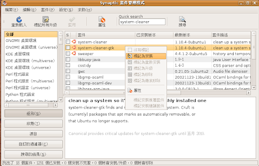 點選〔系統〕→〔管理〕→〔Synaptic〕,並在輸入「System-cleaner」後,「system-cleaner-gtk」按滑鼠右鍵,並選擇「標記為安裝」。