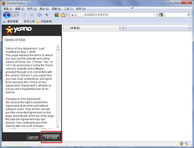 安裝完成此套件後,會在Firefox的側邊欄出現此套件的使用條約,而按下【I Accept】即可。