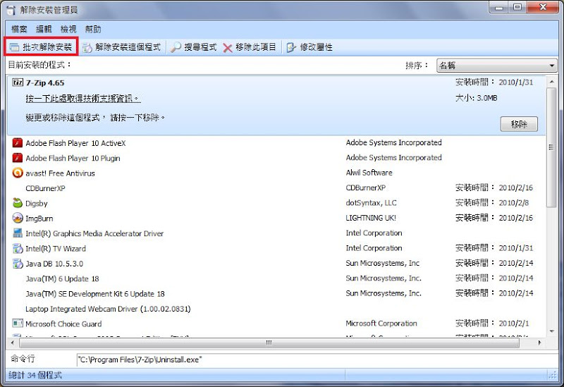 而此程式有批次解除安裝的功能,讓你可以一次同時解除安裝多個程式,首先要按下【批次解除安裝】。