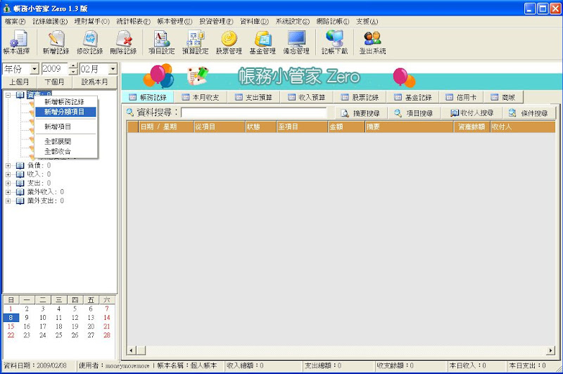開啟帳務小管家 Zero後,先在左側項目表的〔資產〕處,按下【滑鼠右鍵】→【新增分類項目】。