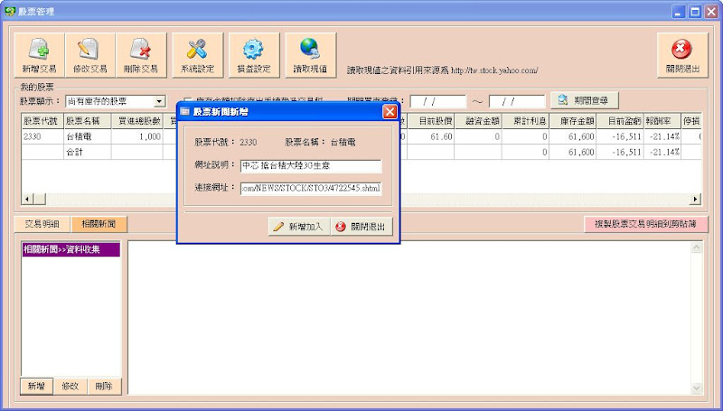 在新增完成持股的資訊後,若要建立該股票的新聞資訊庫,可選取該股票後,按下【相關新聞】→【新增】,並在輸入新聞的標題及網址後,再於「股票新聞新增」的視窗中,依序按下【新增加入】→【關閉退出】即可。