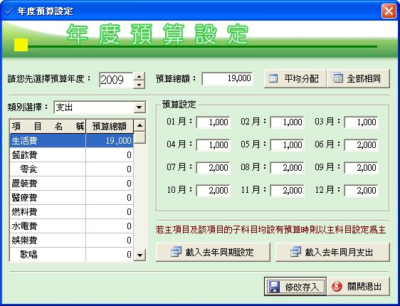 一年之計在於春,若能在歲末年終時,就將新的一年的可見的收入或是支出之預算規畫完整,讓自己的支出有所節制,這樣對於財富的累積,會有莫大的幫助喔!而若要設定年度預算,只要開啟帳務小管家 Zero後,按下功能表上的【理財幫手】→【年度預算設定】,並輸入依各類別輸入年度的預算後,再按下【修改存入】即可。而切換至不同的類別或是子類別時,記得先按下【修改存入】,再進行切換的動作,以免資料遺失。
