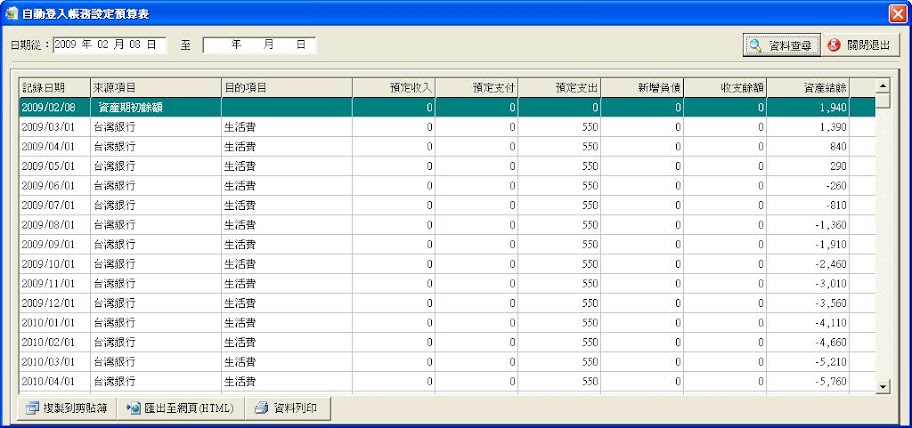 你可以按下功能表上的【記錄維護】→【自動登入帳務設定預算表】,並輸入要查詢的日期區段後,再按下【資料查尋】,以查詢扣款的情形或趨勢。