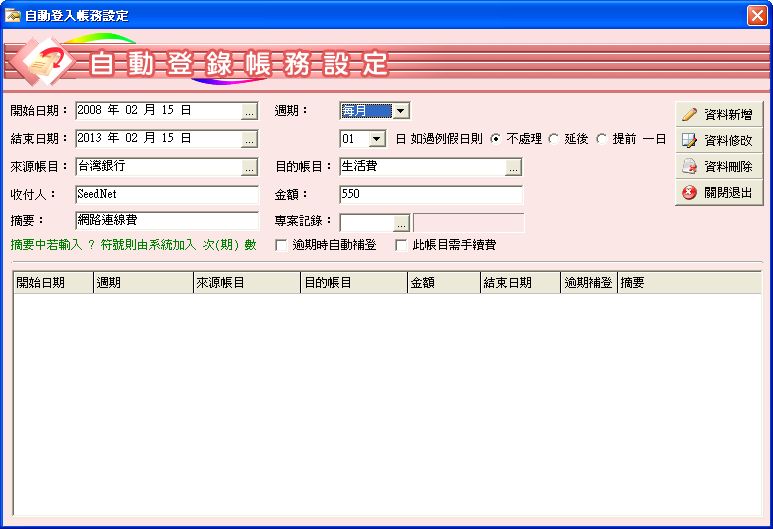 如果你每隔一段時間,都有固定的一筆固定的支出或收入,如網路連線費等,那麼可以在帳務小管家 Zero中,設定自動登錄帳務,以讓帳務小管家 Zero自動提醒並幫您扣款喔!