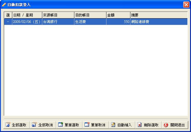 若該帳目的扣款日期到了,會跳出提醒扣款的視窗,選取需要扣款的項目,再按下【自動補入】即可。